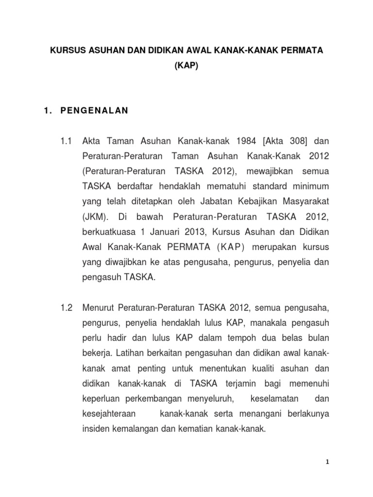 Kursus Asuhan PERMATA 2 Kursus Asuhan Kanak-Kanak PERMATA 5 Motivasi diri 16 motivasi ibu bapa 11 motivasi ibubapa 17 pandangan saya 4 Panduan mendidik anak zaman moden 29 Panduan perniagaan Taska 45 Perkembangan anak-anak 32 perkembangan kanak-kanak 9 PERNIAGAAN TADIKA 2 Promosi TASKA TADIKA 2. Kursus Asuhan PERMATA 2 Kursus Asuhan Kanak-Kanak PERMATA 5 Motivasi diri 16 motivasi ibu bapa 11 motivasi ibubapa 17 pandangan saya 4 Panduan mendidik anak zaman moden 29 Panduan perniagaan Taska 45 Perkembangan anak-anak 32 perkembangan kanak-kanak 9 PERNIAGAAN TADIKA 2 Promosi TASKA TADIKA 2. Berkuatkuasa 1 Januari 2013 KURSUS ASUHAN PERMATA adalah kursus wajib pengusaha pengurus penyelia dan pengasuh bagi menggantikan Kursus Asas Asuhan Kanak.